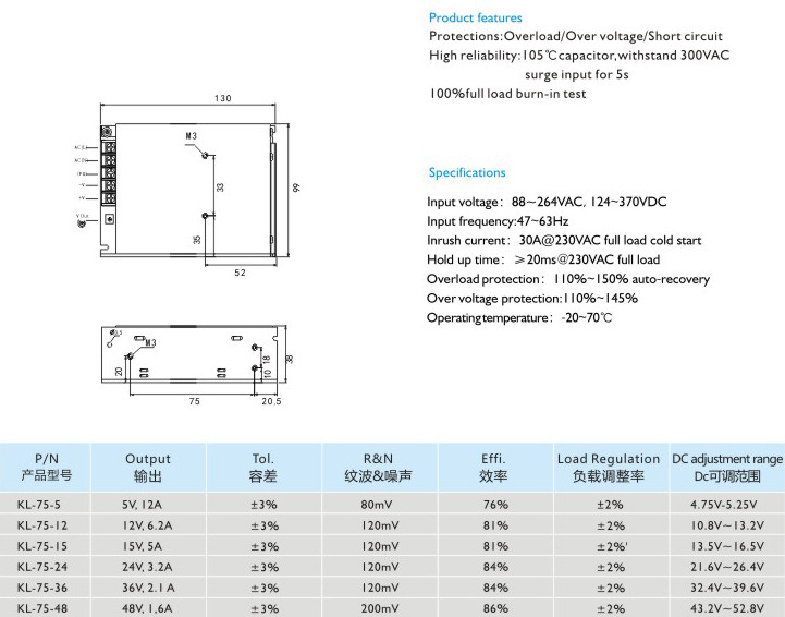 高可靠性:105C長壽命電容,能承受300VAC輸入電壓5秒不損壞 100滿載老化測試 輸入電壓:88-264VAC124-370VDC 輸入頻率:47~63Hz 沖擊電流:30A@230VAC滿載冷態(tài) 保持時間:≥20ms@230VAC滿載 過載保護:110%-150%自動恢復(fù) 過壓保護:110%~145% 運行溫度:-20-70℃" />